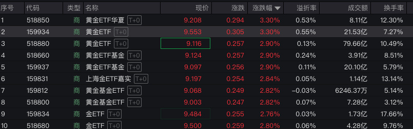 10月14日,黄金期货价格持续上攻,盘中一度触及4183.9美元,日内波动超50美元,目前交投于4181美元附近,黄金相关ETF盘中领涨两市, 截至13:38灿星财富,黄金ETF华夏(518850)涨3.30%,盘中涨幅一度达5.23%,黄金股ETF(159562)涨0.56%,盘中涨幅一度达4.23%,有色金属ETF基金(516650)跌0.85%。